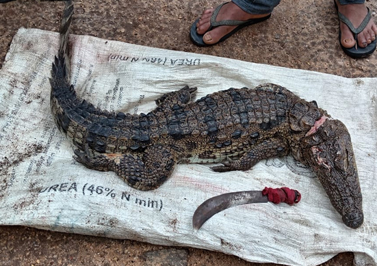 சந்தேக நபர்களிடமிருந்து கொலைசெய்யப்பட்ட முதலையும் கூரிய ஆயுதமும் வனஜீவராசிகள் பாதுகாப்பு திணைக்கள அதிகாரிகளால் கைப்பற்றப்பட்டுள்ளன.