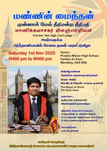 தமிழ்மக்களுக்காகவும், நாட்டுக்காகவும் துணிச்சல் மிகுந்த சேவைகள் ஆற்றி இந்த வருடம் நீதிச் சேவையிலிருந்து ஓய்வுபெற்ற முன்னாள் மேல் நீதிமன்ற நீதிபதி மாணிக்கவாசகர் இளஞ்செழியனைக் கௌரவிக்கும் வகையில் பிரித்தானியா வாழ் வேலணைப் பாடசாலைகளின் பழைய மாணவர்களால் ஏற்பாடு செய்யப்பட்டுள்ள சேவைநலன் பாராட்டு விழா இன்று சனிக்கிழமை (01.11.2025) லண்டனில் சிறப்பாக இடம்பெறவுள்ளது.