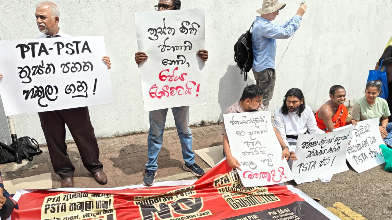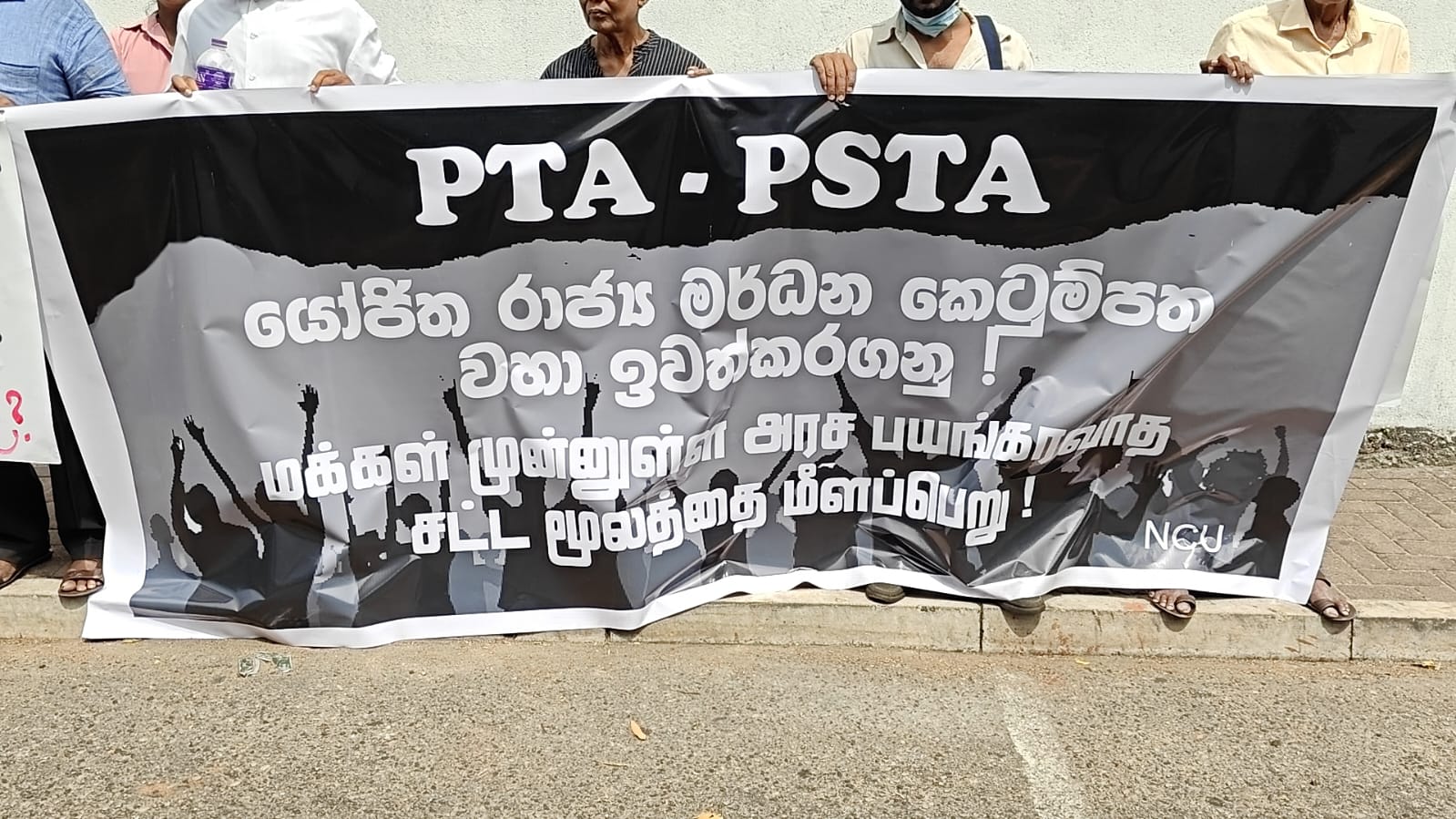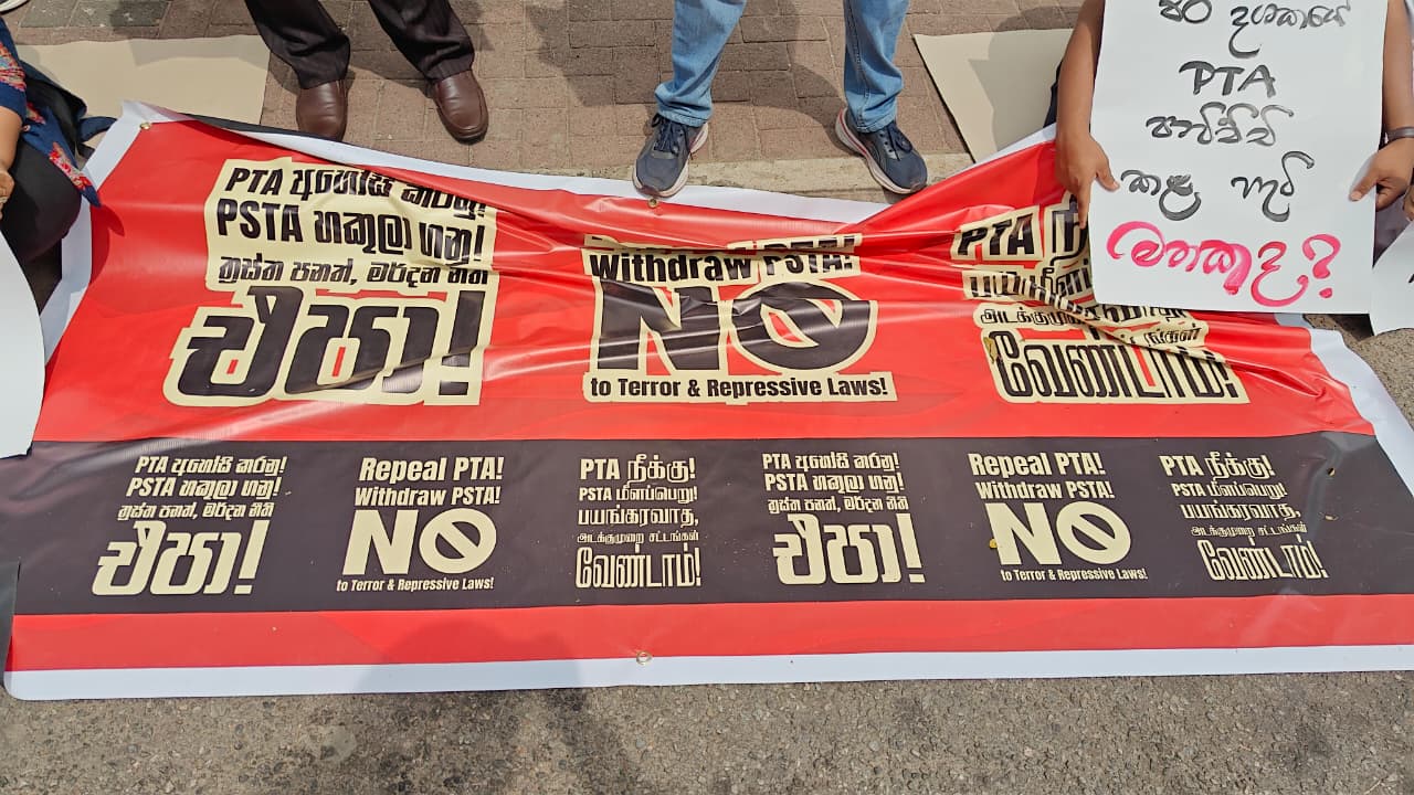 சர்ச்சைக்குரிய பயங்கரவாதத் தடுப்புச் சட்டம் (PTA) மற்றும் புதிதாக முன்மொழியப்பட்டுள்ள நாட்டின் பாதுகாப்பை உறுதிப்படுத்தும் பயங்கரவாத எதிர்ப்புச் சட்டம் (PSTA) ஆகியவற்றை உடனடியாக மீளப் பெறக்கோரி கொழும்பில் உள்ள நீதி அமைச்சிற்கு முன்பாக இன்று பாரிய கவனயீர்ப்புப் போராட்டம் ஒன்று முன்னெடுக்கப்பட்டது.