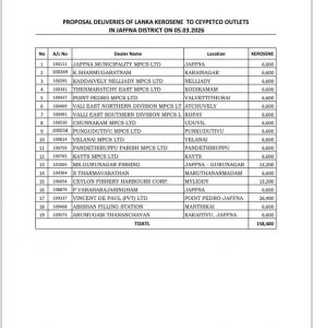 இன்று வியாழக்கிழமை (05.03.2026) யாழ். மாவட்டத்திலுள்ள பெற்றோலியக் கூட்டுத்தாபனத்தின் 34 எரிபொருள் நிரப்பு நிலையங்களுக்கு 290,400 லீற்றர் பெற்றோலும், 19 எரிபொருள் நிரப்பு நிலையங்களுக்கு 158,400 லீற்றர் மண்ணெண்ணையும் விநியோகிக்கப்படவுள்ளதாக யாழ்.மாவட்டச் செயலகத் தரப்புத் தகவல்கள் தெரிவித்துள்ளன.