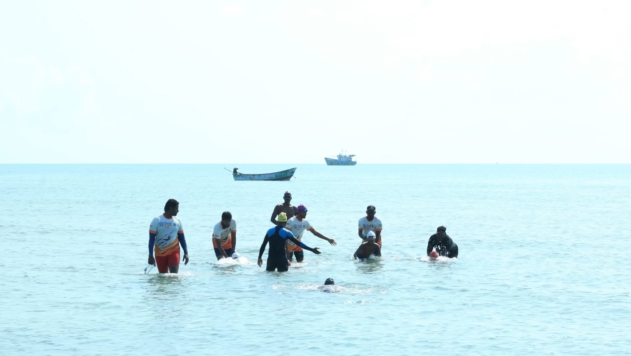 அதனைத் தொடர்ந்து உடனடியாக மீண்டும் தனுஷ்கோடி நோக்கி நீந்தத் தொடங்கி, நேற்று (19) ஞாயிற்றுக்கிழமை காலை 09.27 மணியளவில் ஆரம்பித்த இடத்தையே மீண்டும் சென்றடைந்தனர்.