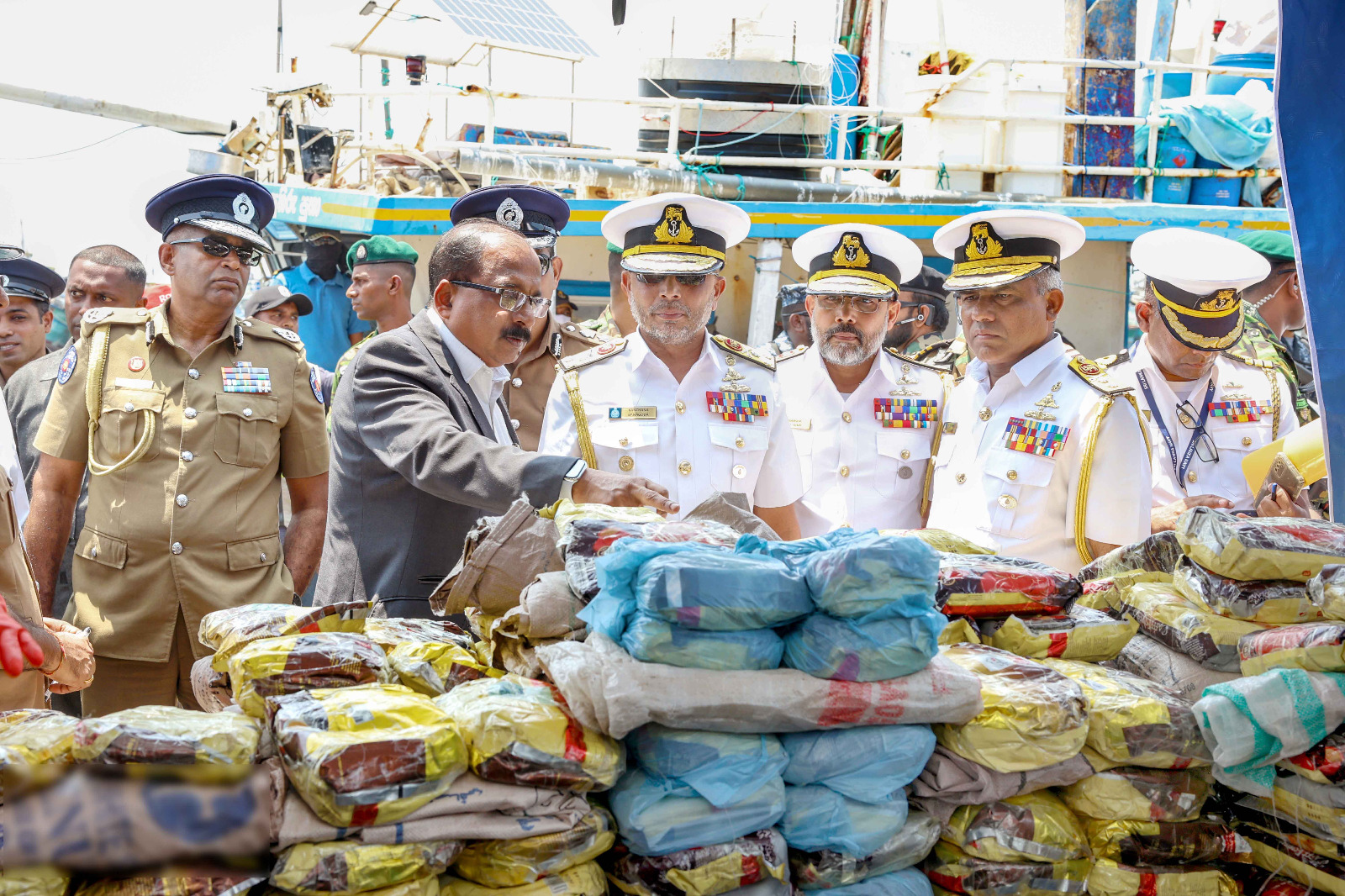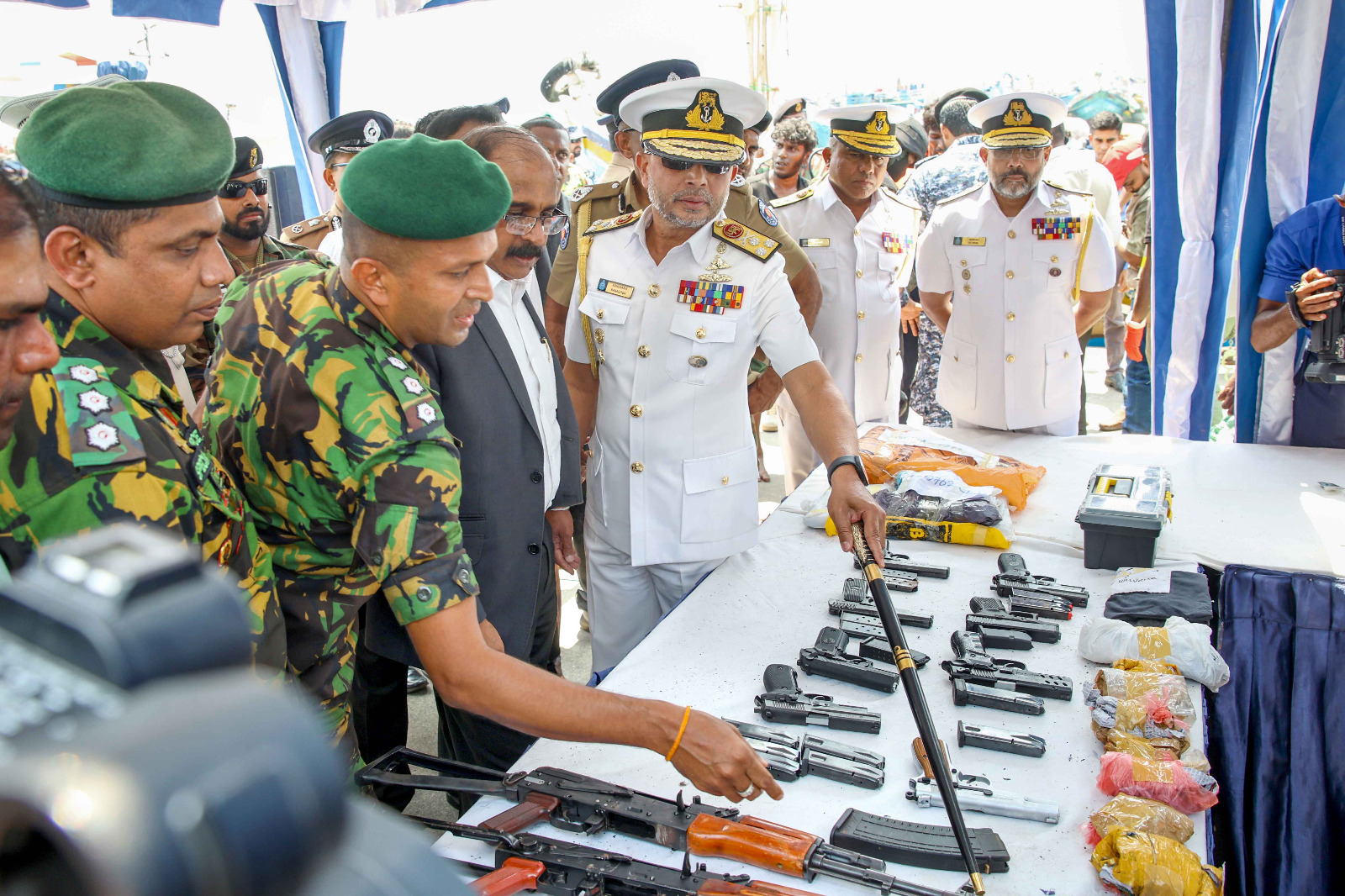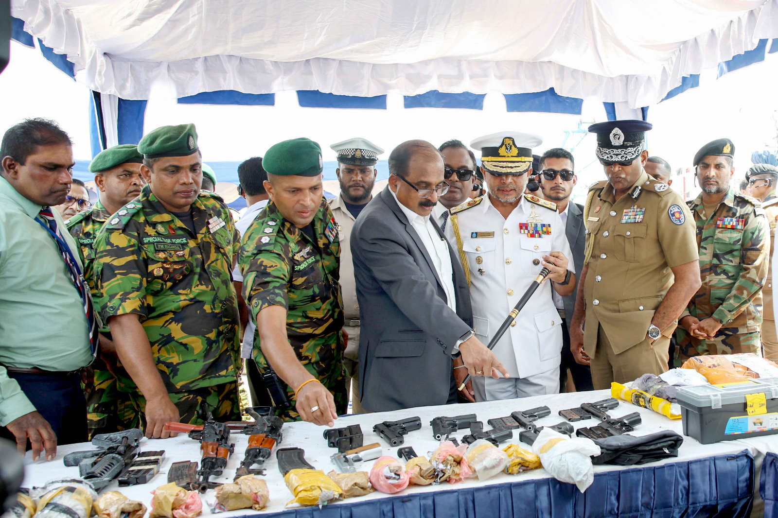 பாதுகாப்பு இராஜாங்க அமைச்சர் மேஜர் ஜெனரல் அருண ஜெயசேகர (ஓய்வு), கடற்படைத் தளபதி வைஸ் அட்மிரல் காஞ்சன பானகொட மற்றும் பொலிஸ் மா அதிபர் பிரியந்த வீரசூரிய ஆகியோர் மீட்கப்பட்ட போதைப்பொருட்கள் மற்றும் ஆயுதங்களை நேரில் பார்வையிட்டு ஆய்வு செய்தனர்.