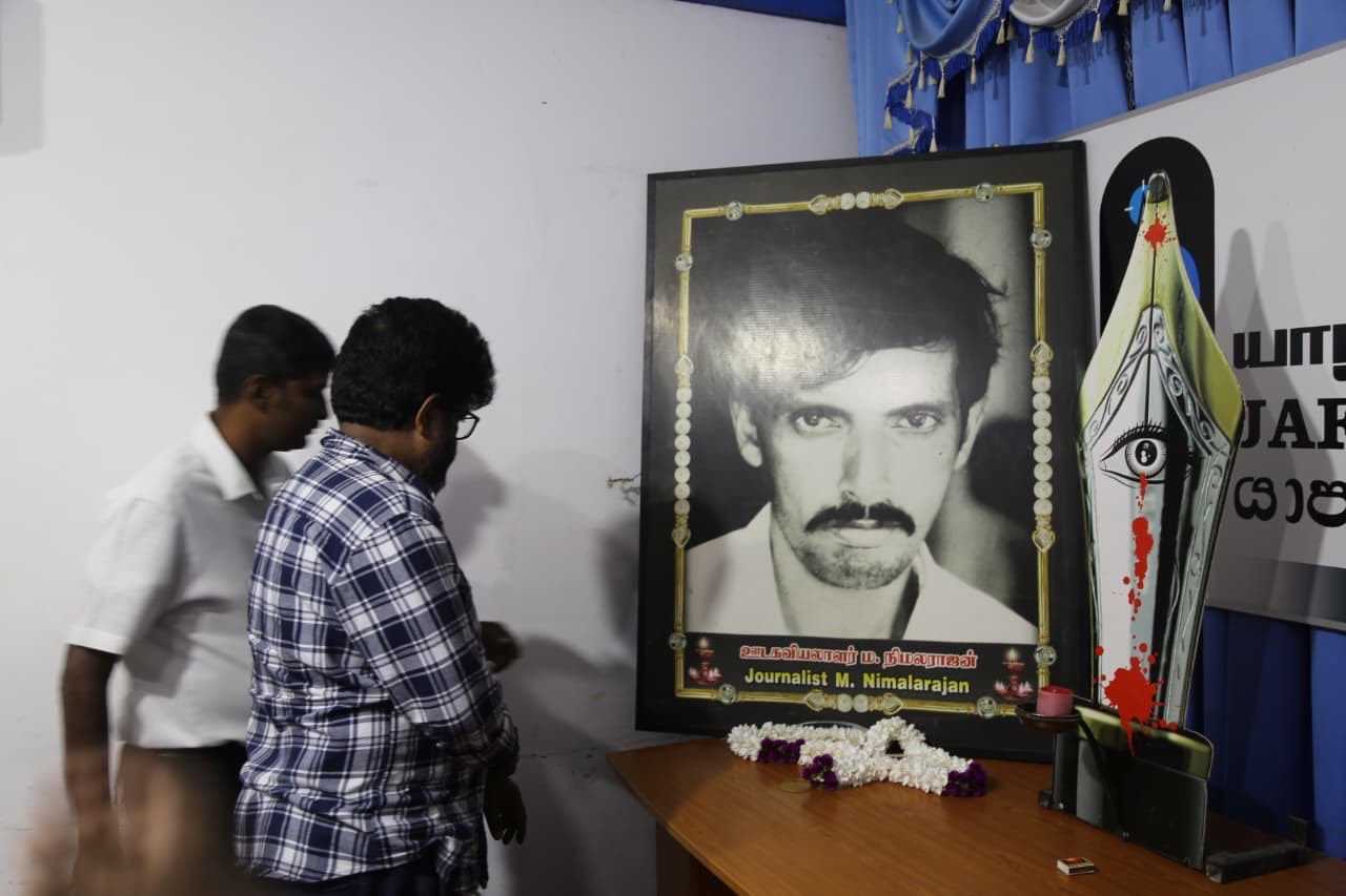 நிமலராஜனின் படத்திற்கு குரலற்றவர்களின் அமைப்பின் ஒருங்கிணைப்பாளர் முருகையா கோமகன் மற்றும் செயற்பாட்டாளரும் ஊடகவியலாளருமான பெடி கமகே மலர் மாலை அணிவித்தனர்.