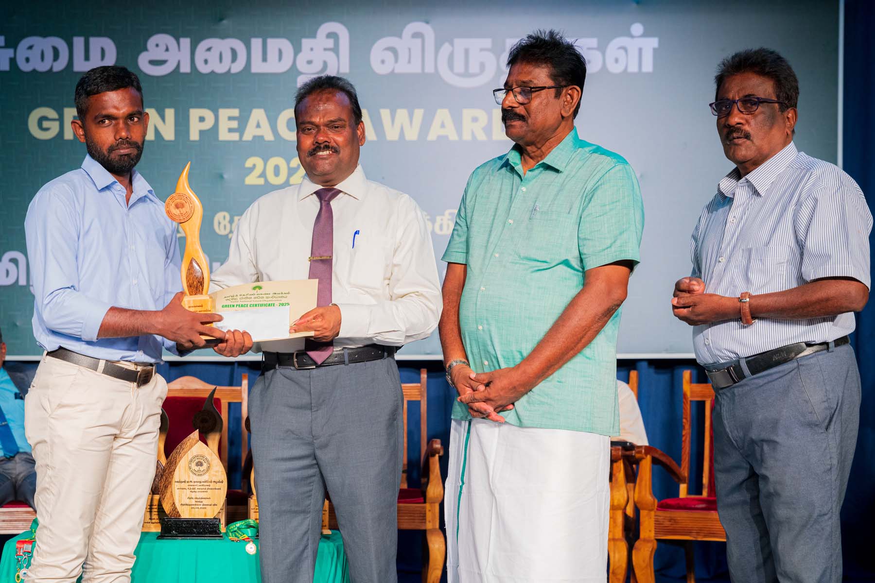 தமிழ்த்தேசியப் பசுமை இயக்கத்தின் ஏற்பாட்டில் 2025 ஆம் ஆண்டுக்கான பசுமை அமைதி விருதுகள் வழங்கும் விழா நேற்று ஞாயிற்றுக்கிழமை (26.04.2026) பிற்பகல் யாழ்ப்பாணப் பல்கலைக்கழக கைலாசபதி கலையரங்கில் தமிழ்த்தேசியப் பசுமை இயக்கத் தலைவர் பொன்னுத்துரை ஐங்கரநேசன் தலைமையில் சிறப்புற நிகழ்ந்தேறியது.