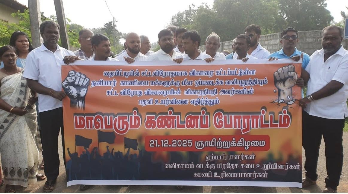 தையிட்டி திஸ்ஸ விகாரைகாக அடாத்தாக கையகப்படுத்தப்பட்டுள்ள தனியார் காணிகளை விடுவிக்குமாறும் , விகாரையின் விகாராதிபதிக்கு வழங்கப்படும் கௌரவத்திற்கு எதிர்ப்பு தெரிவித்தும் , இன்றைய தினம் ஞாயிற்றுக்கிழமை விகாரை முன்பாக போராட்டம் முன்னெடுக்கபட்டது.