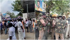 பின்னர் மருத்துவமனை நுழைவு வாயில் முன்பு திரண்டு அவர்கள் ‘வீரச் சந்திரனுக்கு வீரவணக்கம்’, ‘வீரச் சந்திரனை போற்றுவோம், திருப்பரங்குன்றம் மலையில் தீபம் ஏற்றுவோம்’ என்ற கோஷங்களை எழுப்பி ஆர்ப்பாட்டம் செய்தனர். இதன் காரணமாக பிணவறை பகுதியில் பதற்றமான சூழல் உருவானது. 300-க்கும் மேற்பட்ட போலீஸார் குவிக்கப்பட்டுள்ளனர். தொடர்ந்து பிணவறைப் பகுதியில் பதற்றமான சூழலே நிலவி வருகிறது.