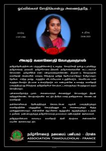 தமிழ்த்தேசியத்தின்பால் பற்றுறுதிகொண்டு உழைத்த செயற்சோதி ஒன்று உறங்கிற்று. தமிழ்ச்சங்கத் தலைவி, தமிழ்ச்சோலை நிர்வாகி, தமிழ்ச்சங்கங்களின் கூட்டமைப்புச் செயலாளர், தமிழாசிரியர் எனப் பன்முகவாற்றல்கொண்ட திருவாட்டி கோகுலதாஸ் கலாஜோதி அவர்களின் மறைவு பிரெஞ்சுத் தமிழ்த் தேசியப்பரப்பிற்குப் பேரிழப்பாகும்.