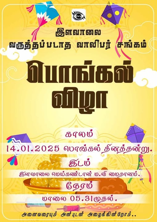 இளவாலை வருத்தப்படாத வாலிபர் சங்கத்தின் கோலாகலப் பொங்கல் விழா செவ்வாய்க்கிழமை (14.01.2025) மாலை-05.30 மணியளவில் இளவாலை மெய்கண்டான் மகா வித்தியாலய மைதானத்தில் இளவாலை வருத்தப்படாத வாலிபர் சங்கத்தின் செயலாளர் ம.மரியநாயகம் தலைமையில் சிறப்பாக இடம்பெறவுள்ளது.
