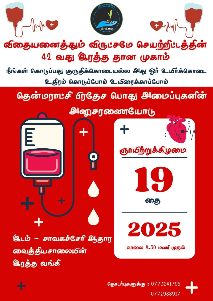 சாவகச்சேரி ஆதார வைத்தியசாலையில் முதன்முறையாக இரத்தவங்கிப் பிரி வுடன் விதையனைத்தும் விருட்சமே குழுமம் இணைந்து தென்மராட்சிப் பொது அமைப்புக்களின் அனுசரணையுடன் நடாத்தும் மாபெரு ம் இரத்ததான முகாம் நாளை ஞாயிற்றுக்கிழமை( 19. 01. 2025) காலை-08.30 மணி முதல் பிற்பகல்-02.30 மணி வரை சாவகச்சேரி ஆதார வைத்தியசாலையில் இடம்பெறவுள்ளது.