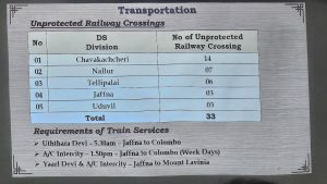 யாழ்ப்பாணத்தில் 33 பாதுகாப்பற்ற ரயில் கடவைகள் காணப்படுவதாக யாழ். மாவட்ட பதில் அரசாங்க அதிபர் ஜனாதிபதி அநுர குமார திசாநாயக்கவிடம் சுட்டிக்காட்டியுள்ளார். யாழ்ப்பாணம் மாவட்ட அபிவிருத்தி ஒருங்கிணைப்பு
