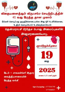 சாவகச்சேரி ஆதார வைத்தியசாலையில் முதன்முறையாக இரத்தவங்கிப் பிரிவுடன் விதையனைத்தும் விருட்சமே குழுமம் இணைந்து தென்மராட்சிப் பொது அமைப்புக்களின் அனுசரணையுடன் நடாத்தும் மாபெரும் இரத்ததான முகாம் நாளை ஞாயிற்றுக்கிழமை( 19. 01. 2025) காலை-08.30 மணி முதல் பிற்பகல்-02.30 மணி