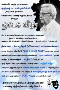 அண்மையில் மறைந்த ஈழத்து தமிழ் நாடகத் துறையின் பிதாமகன் குழந்தை ம.சண்முகலிங்கத்தின் நினைவாகச் சண்டிலிப்பாய்க் கலாசார மத்திய நிலையம் நடாத்தும் நாடக விழா திங்கட்கிழமை (31.03.2025) மாலை-03