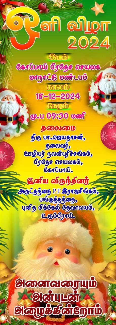 கோப்பாய்ப் பிரதேச செயலகத்தின் ஒளிவிழா-2024 புதன்கிழமை (18.12.2024) காலை-09.30 மணியளவில் கோப்பாய்ப் பிரதேச செயலக மாநாட்டு மண்டபத்தில் கோப்பாய்ப் பிரதேச செயலக ஊழியர் நலன்புரிச் சங்கத் தலைவர் பா.ஜெயதாசன் தலைமையில் இடம்பெறவுள்ளது.