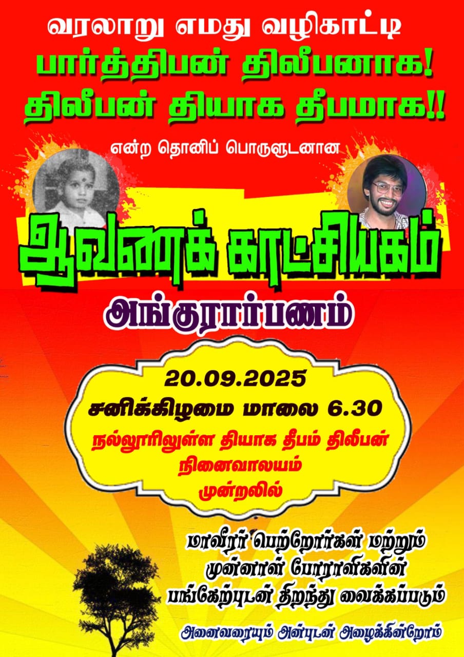தியாகதீபம் திலீபனின் 38 ஆவது ஆண்டு நினைவேந்தலை முன்னிட்டுத் திலீபனின் வரலாற்றினை அடுத்த சந்ததியினருக்குக் கடத்தும் முகமாக அவரின் வரலாற்றினை எடுத்தியம்பும் பார்த்தீபன் திலீபனாக! திலீபன் தியாக தீபமாக!! எனும் தொனிப்பொருளுடனான ஆவணக் காட்சியகம் இன்று சனிக்கிழமை (20.09.2025) மாலை-06.30 மணியளவில் நல்லூரிலுள்ள தியாகதீபம் திலீபன் நினைவுத் தூபிக்கு முன்பாக மாவீரர்களின் பெற்றோர்கள், முன்னாள் போராளிகளின் பங்கேற்புடன் திறந்து வைக்கப்படவுள்ளது.