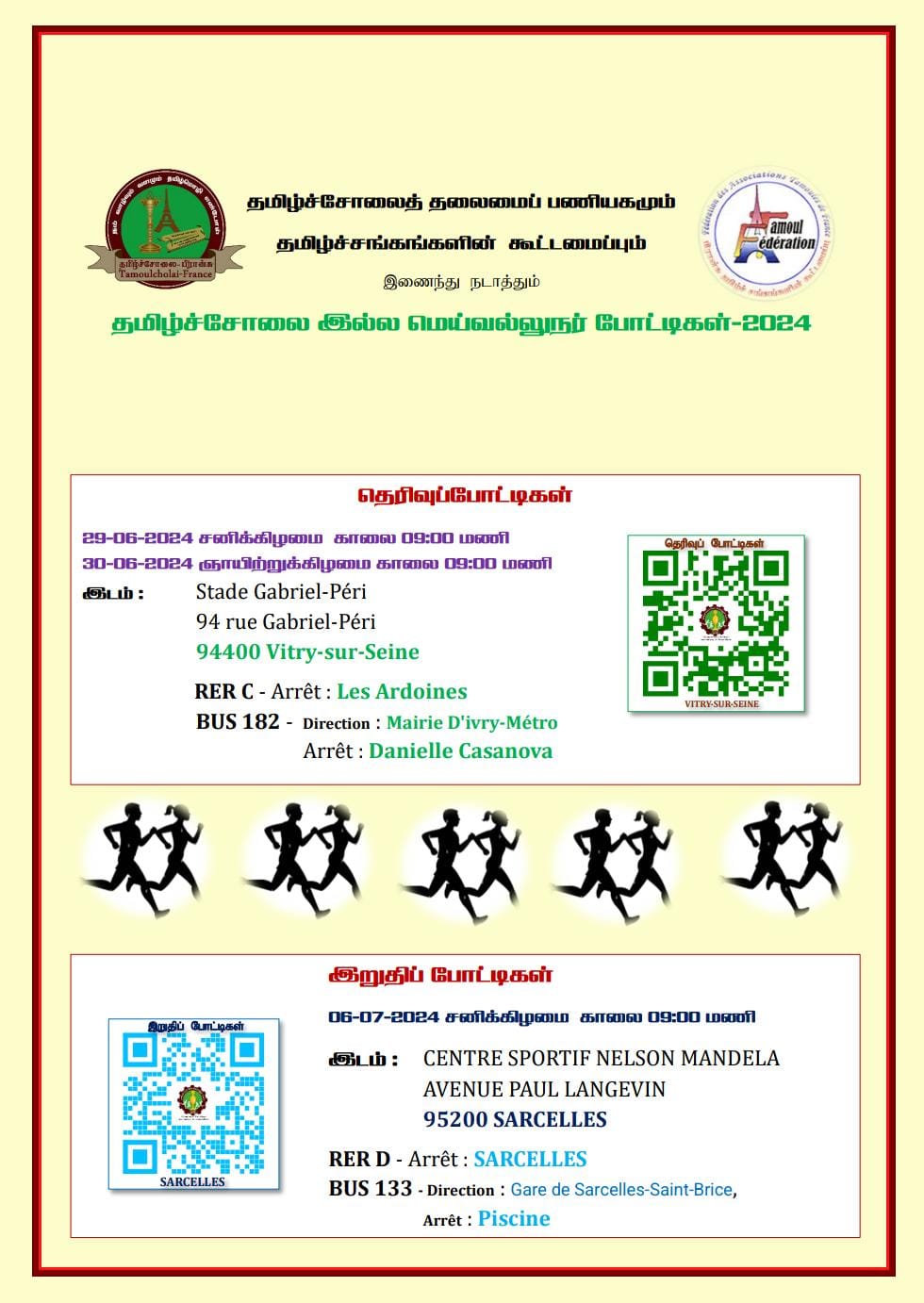 பிரான்சில் தமிழர் ஒருங்கிணைப்புக் குழு தமிழர் விளையாட்டுத்துறையின் ஆதரவில் பிரான்சு தமிழ்ச்சோலைத் தலைமைப் பணியகமும் தமிழ்ச் சங்கங்களின் கூட்டமைப்பும் இணைந்து நடாத்தும் தமிழ்ச்சோலைப் பள்ளிகளிடையிலான தமிழ்ச்சோலை இல்ல மெய்வல்லுநர் போட்டிகள் 2024 சிறப்பாக இடம்பெற ஏற்பாடுசெய்யப்பட்டுள்ளது.